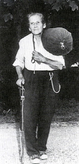 Et pour enfoncer le clou en ce qui concerne le matériel inutilement lourd, ou tout simplement inutile, Jardine d'employer l'argument qui tue et que je prends dans les dents avec mon sac McHale et ma cuillère en titane: Il nous bazarde la photo de Grandma Gatewood qui, au milieu du XXe siècle, s'est mise à randonner comme une cinglée (deux fois l'Appalachian Trail, entre autres). Petit détail technique: regardez donc l'équipement complet de randonnée de Grandma sur la photo ci-dessous:
